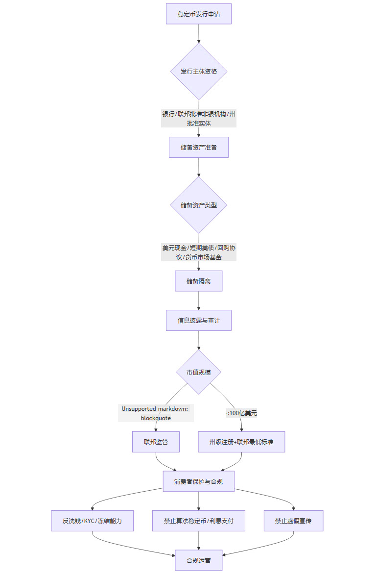 市值超过100亿美元的稳定币发行方(如Tether、Circle)必须接受联邦机构(美联储、OCC)的直接监管。