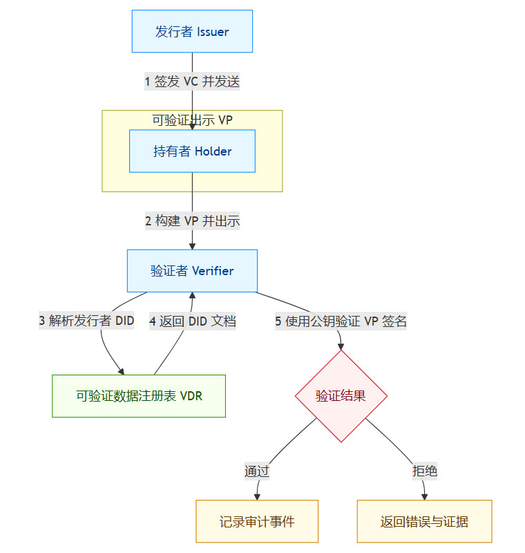 issuerDID,从VDR获取发行者的DID文档,并用其中的公钥验证VC的签名。双重验证通过,信任建立。