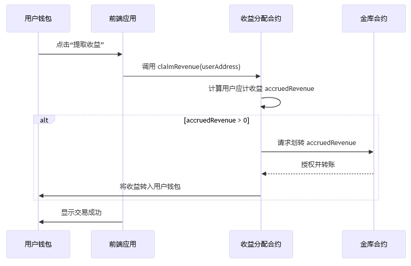 应计收益与可提取收益分离:合约可以区分两个概念。**应计收益(Accrued Revenue)按秒计算,展示给用户。但可提取收益(Claimable Revenue)**则严格与金库中的实际资金余额挂钩。只有当真实资金到位后,对应的应计收益才转化为可提取。这种设计在保证透明度的同时,也确保了协议的偿付能力。