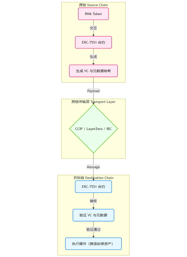 ERC-7551标准本身不处理资产的跨链传输,它只定义“货物”的标准化封装。这个“货物”就是RWA资产及其关联的权利与合规信息。它将资产的内在属性(元数据)和状态证明(可验证凭证)与具体的跨链传输协议(如CCIP、LayerZero、IBC)解耦。