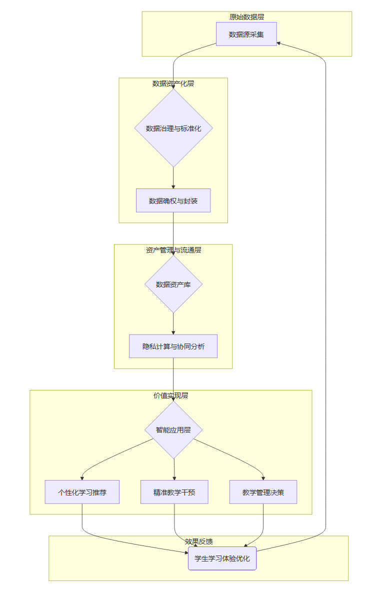 价值实现与反馈。应用效果(如学生成绩提升、学习兴趣增强)会产生新的数据,回流到数据源,形成持续优化的正向循环。