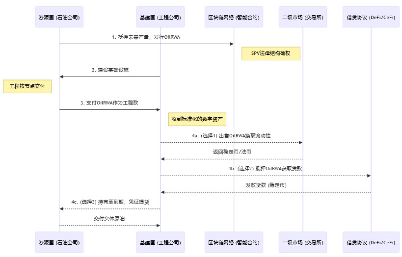 国际贸易中一个经典的模式是“资源换工程”。资源丰富的国家(如产油国、矿产国)用其未来的资源产出作为支付承诺,换取技术先进国家为其建设基础设施(如港口、铁路、发电站)。传统模式下,这个过程依赖于复杂的长期贷款、主权担保和多边金融机构的介入,流程漫长且充满不确定性。