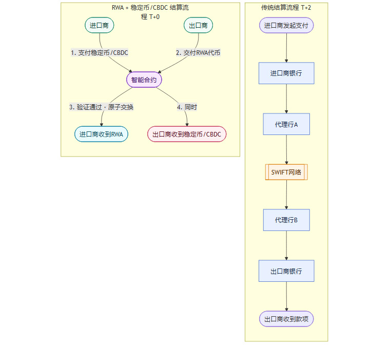 这个流程图清晰地展示了RWA体系如何通过智能合约实现**“一手交钱,一手交货”**的原子化结算,从根本上消除了传统贸易中的结算风险和时间延迟。