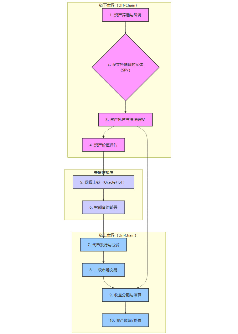 RWA的实现并非简单的“上链”动作,它涉及一套严谨的法律、技术与金融工程组合。其流程可以概括为“链下资产打包-链上代币发行-持续运营清算”三个阶段。