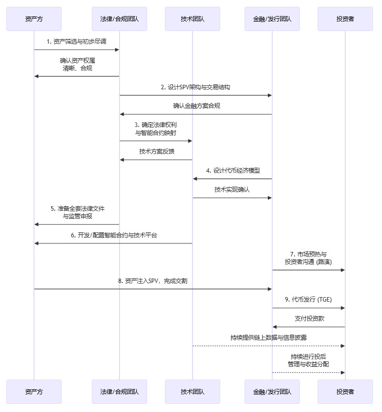 一个完整的RWA项目,其端到端的流程远比申请一笔银行贷款或发行一笔传统债券要复杂。它是一个高度非标、多方协同的系统工程。
