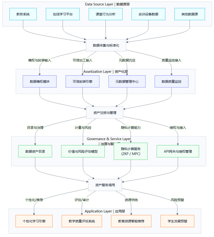 这个架构的核心设计思想是**“原始数据不出域,数据价值可流通”**。通过在资产化层和治理层的层层封装与管控,确保了高度敏感的教育数据在得到充分利用的同时,其安全与隐私也得到有力保障。