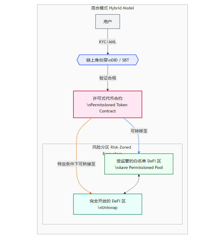 生态系统被划分为不同的风险区域。用户可以自由地在经过平台审核的、合规的“白名单DeFi区”内活动。