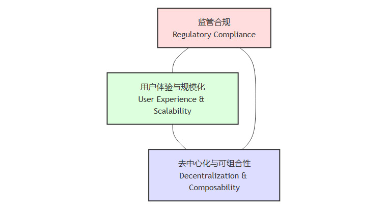 两种路径的分化,并非源于技术能力的差异,而是对一个经典问题的战略取舍。这个问题可以被概括为金融创新的**“不可能三角”**。这个模型指出,在设计一个金融产品或系统时,监管合规、去中心化与可组合性、用户体验与规模化这三个目标,几乎不可能同时达到最优。最大化其中两点,往往意味着在第三点上做出妥协。
