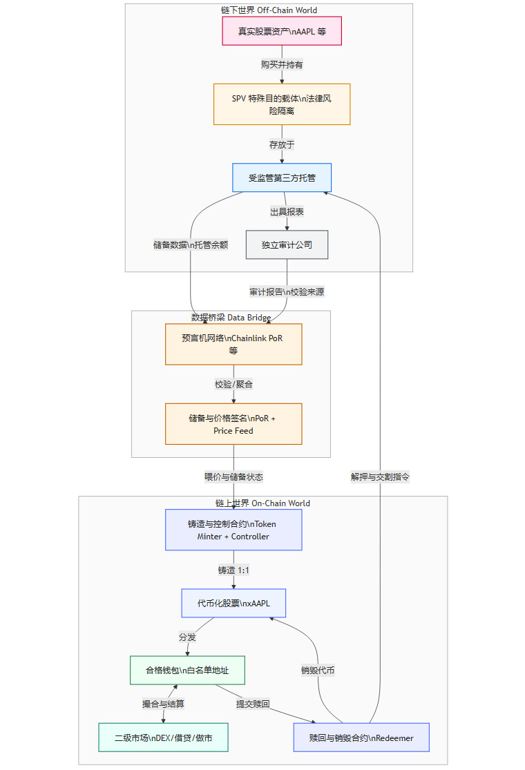 资产隔离 (Asset Off-chaining & Isolation):首先,发起方(如Backed Finance)需在合规的司法管辖区(如瑞士)设立一个独立的法律实体,即特殊目的载体(SPV)。真实股票由该SPV购买并持有。