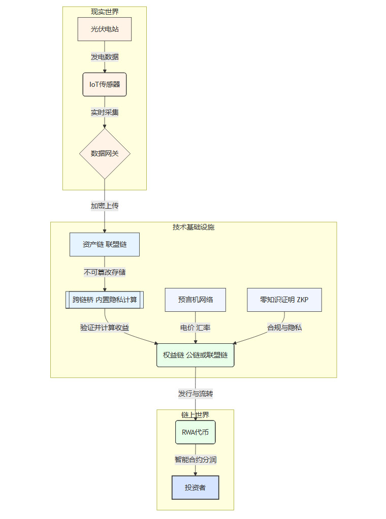 这张流程图展示了这些技术如何协同工作,支撑一个典型的实体资产RWA项目(以光伏电站为例)的完整生命周期。