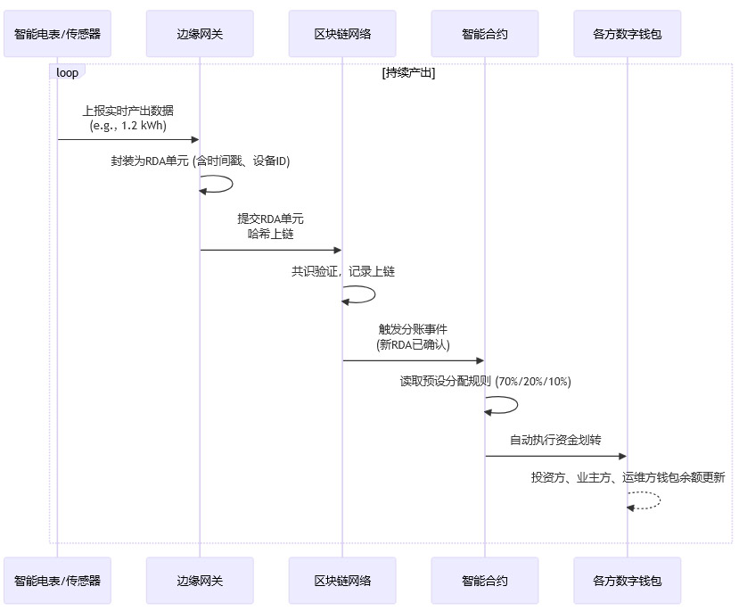 其二,在能源与算力等连续产出行业,它将发电量、算力输出等实绩曲线切割为标准化的RDA单元,通过智能合约实现“产出即分配”的实时结算,彻底颠覆了传统的计费与分账模式。