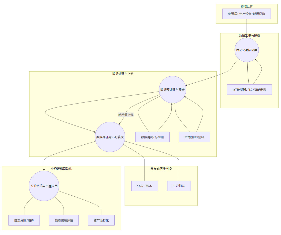 技术可信性:信任并非来自中心化机构的背书,而是源于技术组合。物联网(IoT)保证数据源头采集的自动化,边缘计算进行初步处理与加密,区块链提供不可篡改的存证,智能合约则负责执行预设的商业逻辑。