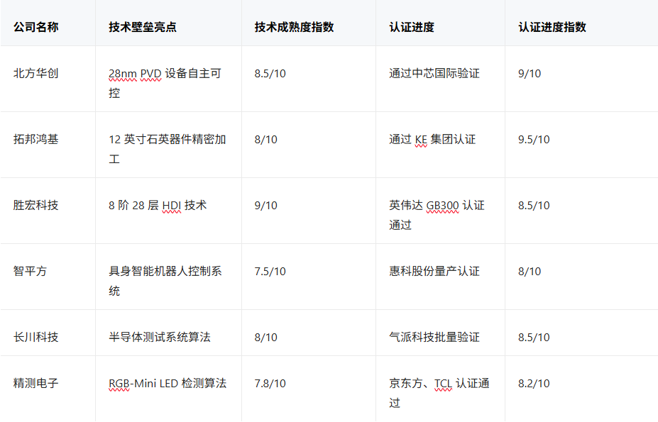拓邦鸿基的认证进度指数最高,其通过 KE 集团认证的难度极高,尤其是 12 英寸高温区石英制品长期被外资垄断,这一突破使公司成为国内唯一具备全球竞争力的石英器件供应商。北方华创在半导体设备领域技术成熟度领先,其 28nm PVD 设备已稳定运行于中芯国际产线,为后续更先进制程突破奠定基础。胜宏科技的高阶 HDI 技术形成代差优势,8 阶 28 层 HDI 与 16 层任意互联技术的突破使其在 AI 服务器 PCB 领域占据制高点。