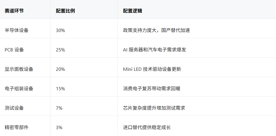 基于上述分析,构建 "核心赛道 + 弹性标的" 的投资组合,重点配置技术壁垒高、订单能见度高、短期催化剂明确的企业。结合当前市场环境和行业景气度,建议如下配置比例: