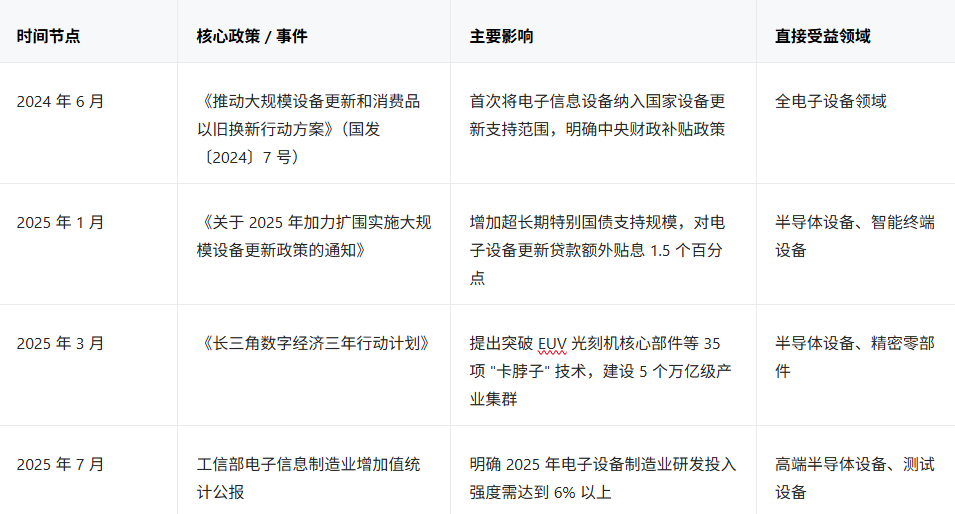近年来,国家层面持续加码电子生产设备产业支持政策,形成了 "顶层设计 - 资金支持 - 市场培育" 的全链条政策体系。2024 年《推动大规模设备更新和消费品以旧换新行动方案》首次将电子信息设备纳入重点支持领域,2025 年政策进一步扩围,通过超长期特别国债提供额外资金支持,形成政策连续性和加码效应。