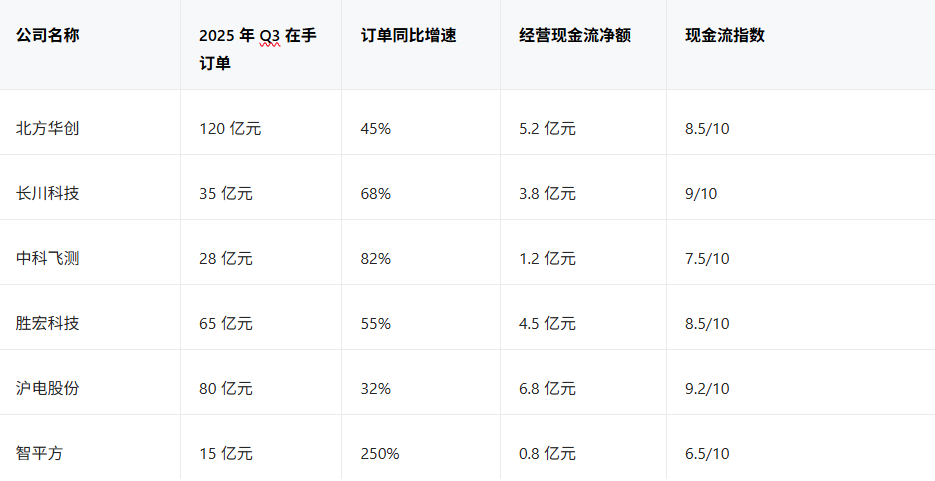 沪电股份的现金流指数最高,其 80 亿元的在手订单主要来自通信设备和汽车电子领域,订单结构均衡且客户付款能力强,经营现金流净额达 6.8 亿元,显著高于净利润,显示盈利质量优良。长川科技和中科飞测的订单增速最快,分别达到 68% 和 82%,反映封测设备行业的高景气度。智平方虽然订单增速惊人,但由于项目实施周期较长,现金流尚未完全匹配,投资者需关注后续交付进度。北方华创作为半导体设备龙头,120 亿元的在手订单为其业绩增长提供了坚实基础,订单同比增速 45% 显示行业需求旺盛。