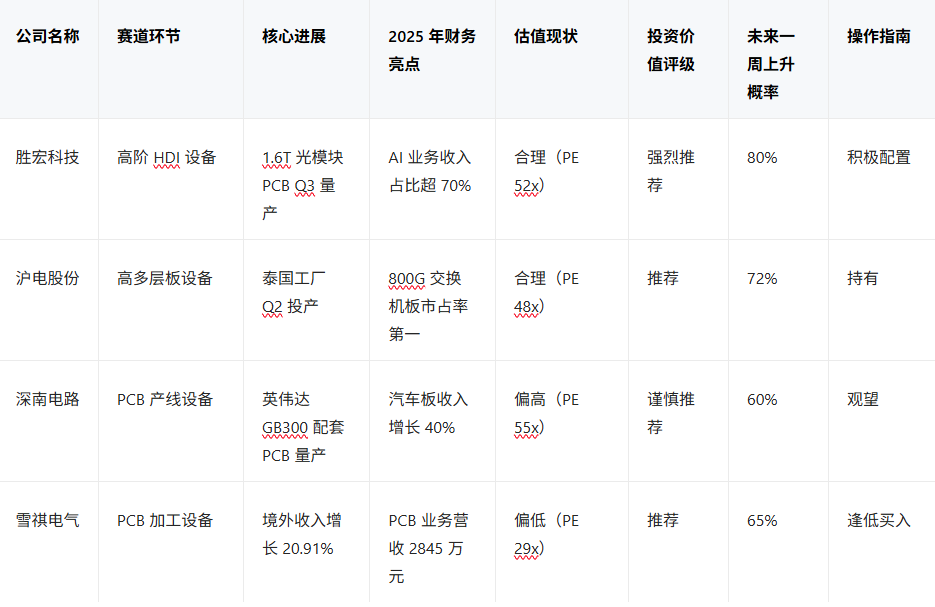PCB 设备赛道在 AI 服务器和汽车电子的双重拉动下,呈现高景气度。胜宏科技和沪电股份作为行业龙头,合计占据全球 70% 以上高端 AI 服务器 PCB 订单,技术壁垒和客户粘性构筑了护城河。