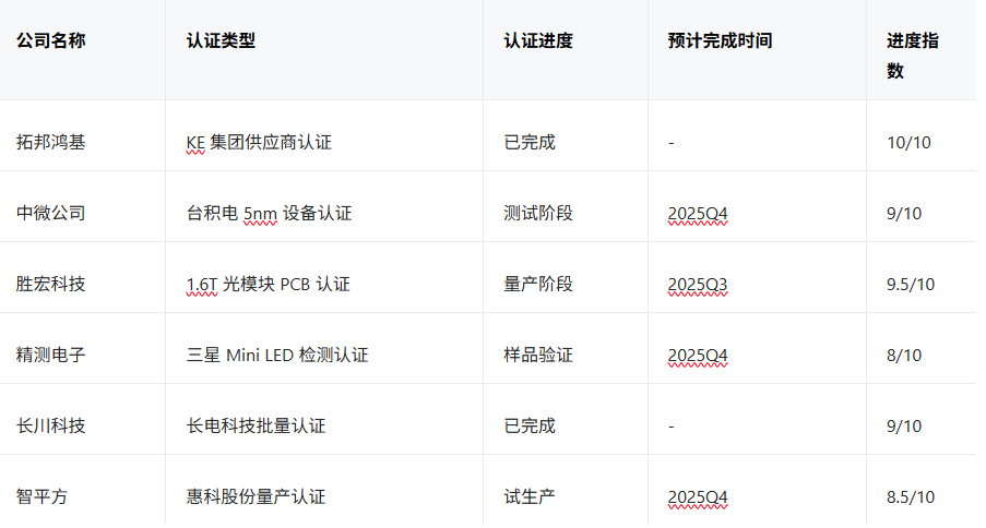 拓邦鸿基的认证进度最为领先,已完成全球半导体设备龙头 KE 集团的供应商认证,成为中国大陆地区唯一获此认证的企业,为其拓展全球市场铺平了道路。胜宏科技的 1.6T 光模块 PCB 在 2025 年 Q3 进入量产阶段,较同业领先 6-12 个月,将率先受益于光模块升级浪潮。中微公司的 5nm 刻蚀机在台积电测试进展顺利,预计 2025Q4 完成认证,若能通过将标志着国产刻蚀设备达到国际领先水平。智平方的具身智能机器人在惠科股份进入试生产阶段,预计 2025Q4 完成量产认证,批量交付后将显著提升公司业绩。