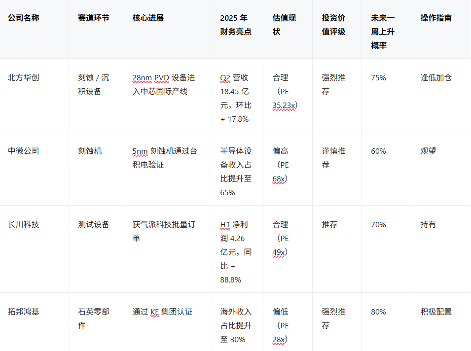 北方华创作为国内半导体设备龙头,产品矩阵最为完整,2025 年 Q2 营收环比增长 17.8%,显示订单交付加速。拓邦鸿基的突破具有标志性意义,其 12 英寸石英器件进入全球龙头供应链,打破了日本企业的长期垄断,按照半导体设备零部件 5-8 年的认证周期,公司有望在未来 3 年持续受益于进口替代红利。长川科技在测试设备领域的批量订单验证了国产设备的可靠性,随着 AI 芯片测试需求增加,公司有望保持高速增长。