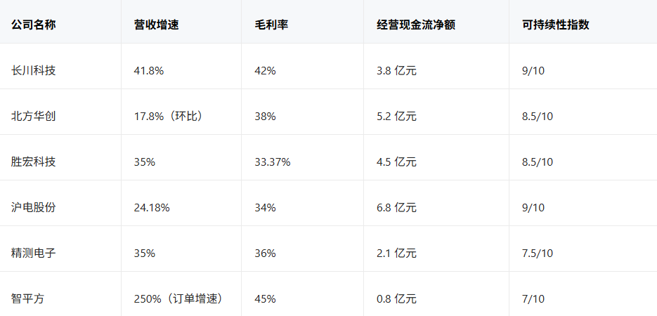 沪电股份和长川科技的可持续性指数最高,沪电股份凭借通信设备板的技术溢价(800G 交换机板毛利率超 40%)和精细化成本控制(铜蚀刻液回收率 98%),保持了稳定的盈利能力。长川科技则受益于测试设备的高景气度,营收和净利润同步高速增长,经营现金流净额达 3.8 亿元,显示盈利质量优良。智平方虽然订单增速惊人,但现金流尚未完全体现,主要因项目实施周期较长,可持续性仍需观察。胜宏科技较高的研发投入(H1 研发费用 3.53 亿元,+78.46%)虽然短期影响毛利率,但为长期技术领先奠定基础。
