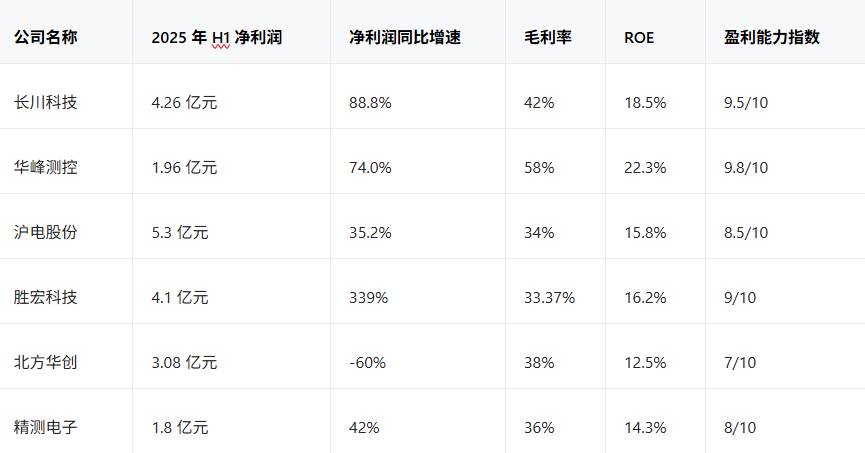 华峰测控的盈利能力指数最高,作为国内半导体测试设备的龙头企业,其毛利率高达 58%,ROE 达 22.3%,显示出极强的技术溢价能力。胜宏科技净利润增速惊人,主要受益于 AI 服务器 PCB 需求爆发,其 AI 相关业务收入占比超 70%,带动公司整体盈利能力提升。长川科技在封测设备领域的领先地位使其净利润增速达 88.8%,毛利率稳定在 42%,呈现量利齐升的良好态势。北方华创因计提减值导致净利润下滑,但毛利率仍保持在 38% 的较高水平,随着订单交付加速,盈利能力有望逐步恢复。