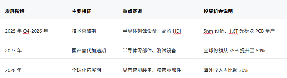 2025 年 Q4 至 2026 年是技术突破的关键期,中微公司的 5nm 刻蚀机和胜宏科技的 1.6T 光模块 PCB 将进入量产阶段,标志着国产设备在高端领域的突破。2027 年行业将进入国产替代加速期,拓邦鸿基等半导体零部件企业的全球市场份额有望从当前的 35% 提升至 50%,显著受益于供应链安全需求。2028 年头部企业将进入全球化拓展期,智平方的显示智能装备和拓邦鸿基的精密零部件有望实现大规模出口,海外收入占比超过 30%,成为新的增长引擎。
