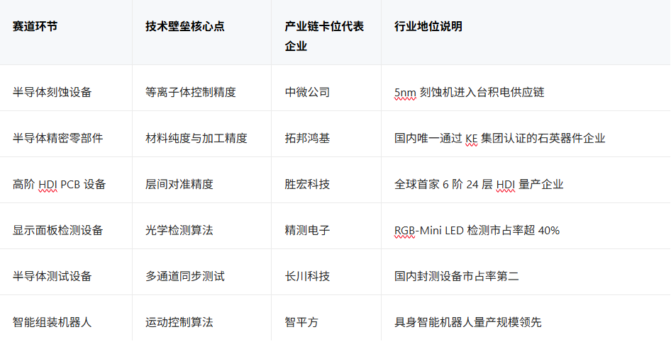 在这个充满机遇与挑战的赛道上,核心变量清晰可见:半导体设备的认证进度决定了国产替代的节奏,PCB 设备的技术代差塑造了竞争格局,显示智能装备的订单交付验证了商业化能力。拓邦鸿基的石英器件突破、胜宏科技的 HDI 技术领先、长川科技的测试设备放量,共同勾勒出行业的投资脉络。