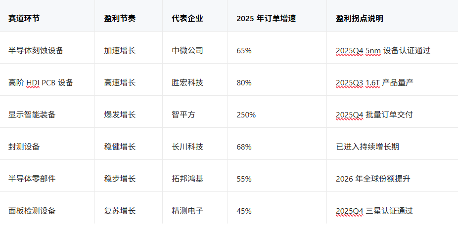 智平方所在的显示智能装备赛道盈利节奏最为陡峭,250% 的订单增速预示 2025Q4 将进入批量交付期,成为短期业绩弹性最大的赛道。胜宏科技的高阶 HDI PCB 设备业务在 1.6T 光模块产品量产后,有望迎来收入和毛利率的双重提升,2025Q3 成为重要的业绩拐点。中微公司的盈利拐点取决于 5nm 刻蚀机的认证进度,若 2025Q4 通过台积电认证,将打开未来 2-3 年的成长空间。拓邦鸿基虽然短期订单增速不及前述企业,但凭借全球领先的技术实力,预计 2026 年开始全球市场份额将显著提升,进入稳步增长阶段。