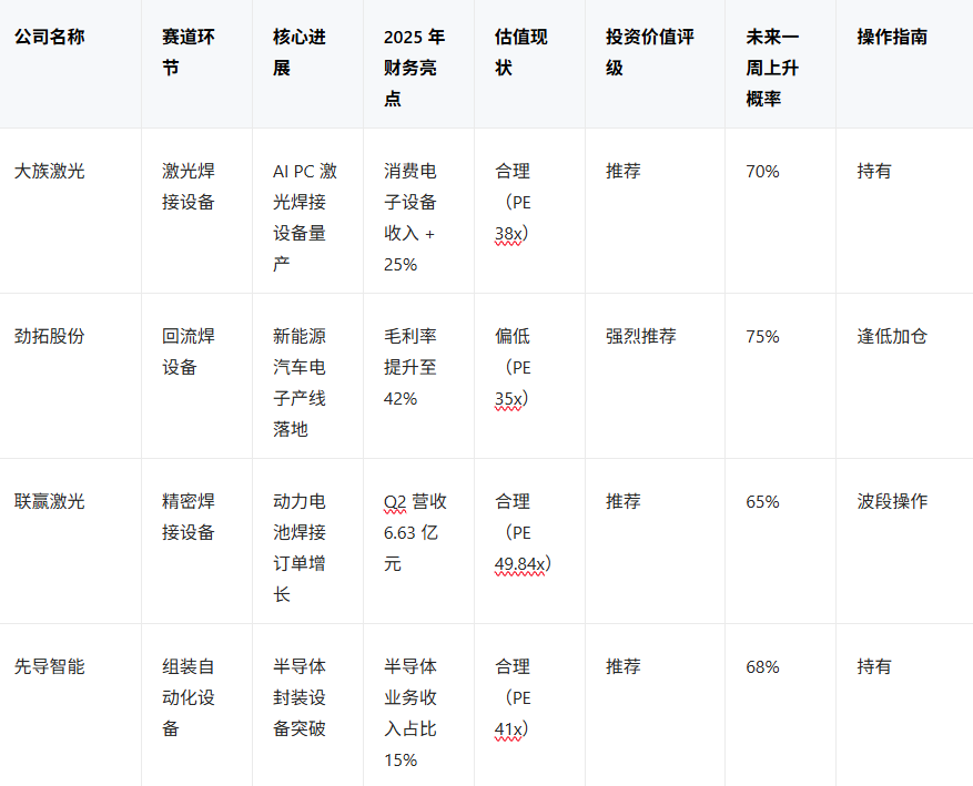 劲拓股份在新能源汽车电子领域的布局开始见效,其高精度回流焊设备进入比亚迪 800V 平台供应链,毛利率提升至 42%,显示产品结构优化成效显著。大族激光的 AI PC 激光焊接设备随着联想、华硕等新品量产而订单增加,2025 年消费电子设备收入预计增长 25%。联赢激光虽然 Q2 营收略有下滑,但动力电池焊接设备在储能领域的应用拓展为公司提供了新的增长点。