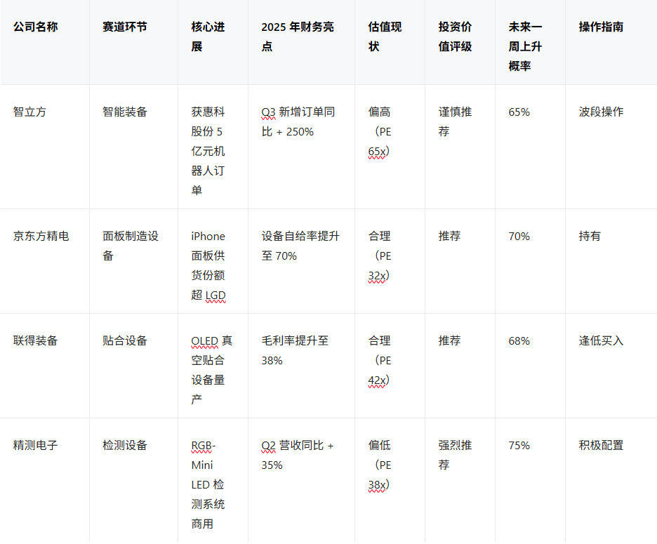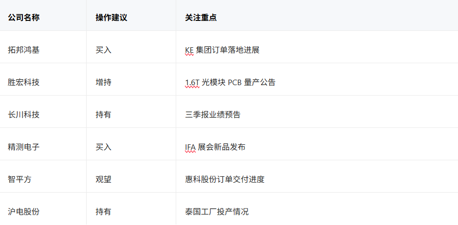 拓邦鸿基建议买入,公司作为国内唯一通过 KE 集团认证的石英器件企业,有望在近期获得首批订单,考虑到其当前 PE 仅 28 倍,估值处于偏低水平,安全边际较高。胜宏科技可适度增持,重点关注 1.6T 光模块 PCB 量产公告,该产品技术代差明显,量产后将显著提升公司估值中枢。精测电子受益于 IFA 2025 展会对显示技术的催化,公司 RGB-Mini LED 检测设备有望获得新订单,当前估值合理,具备短期上涨潜力。智平方因估值偏高(PE 65x)建议观望,待订单交付确认后再介入更为稳妥。