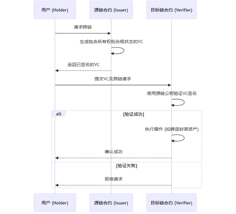 持有与呈现(Holding & Presentation):用户(Holder)持有这份VC,并将其作为跨链消息的一部分,通过传输通道提交给B链上的ERC-7551合约。
