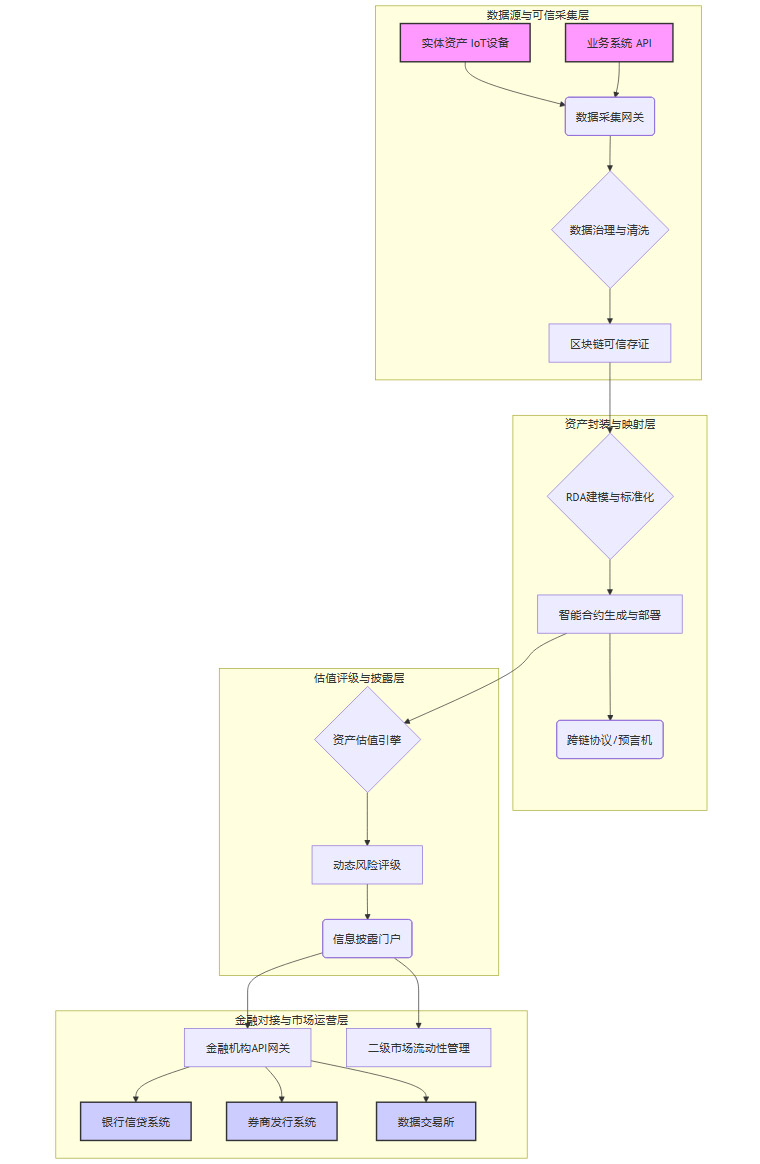 一个典型的RDA运营中台可以被划分为四个核心层次,自下而上分别是数据源与可信采集层、资产封装与映射层、估值评级与披露层、金融对接与市场运营层。每一层都由相应的技术组件和业务流程构成。