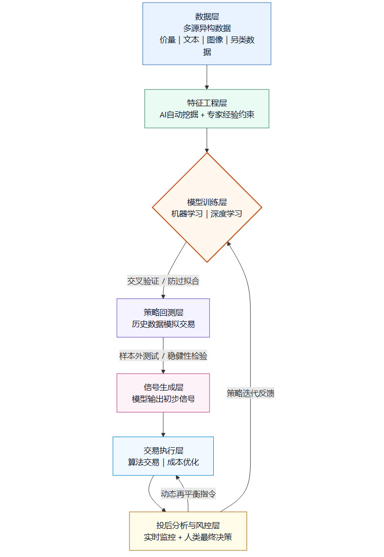 流程的起点是数据。AI量化所需的数据远超传统金融终端,涵盖了结构化的行情数据、财务数据,以及新闻、研报、社交媒体等非结构化数据,乃至卫星图像、支付数据等另类数据。数据基建的能力,即获取、清洗、整合这些多源异构数据的能力,已成为量化机构的第一道护城河。在特征工程环节,AI可以利用算法自动挖掘数以千计的潜在因子,而经验丰富的基金经理则负责提供经济学直觉,指导AI在更有可能产生价值的方向上进行探索,避免“瞎找特征”。